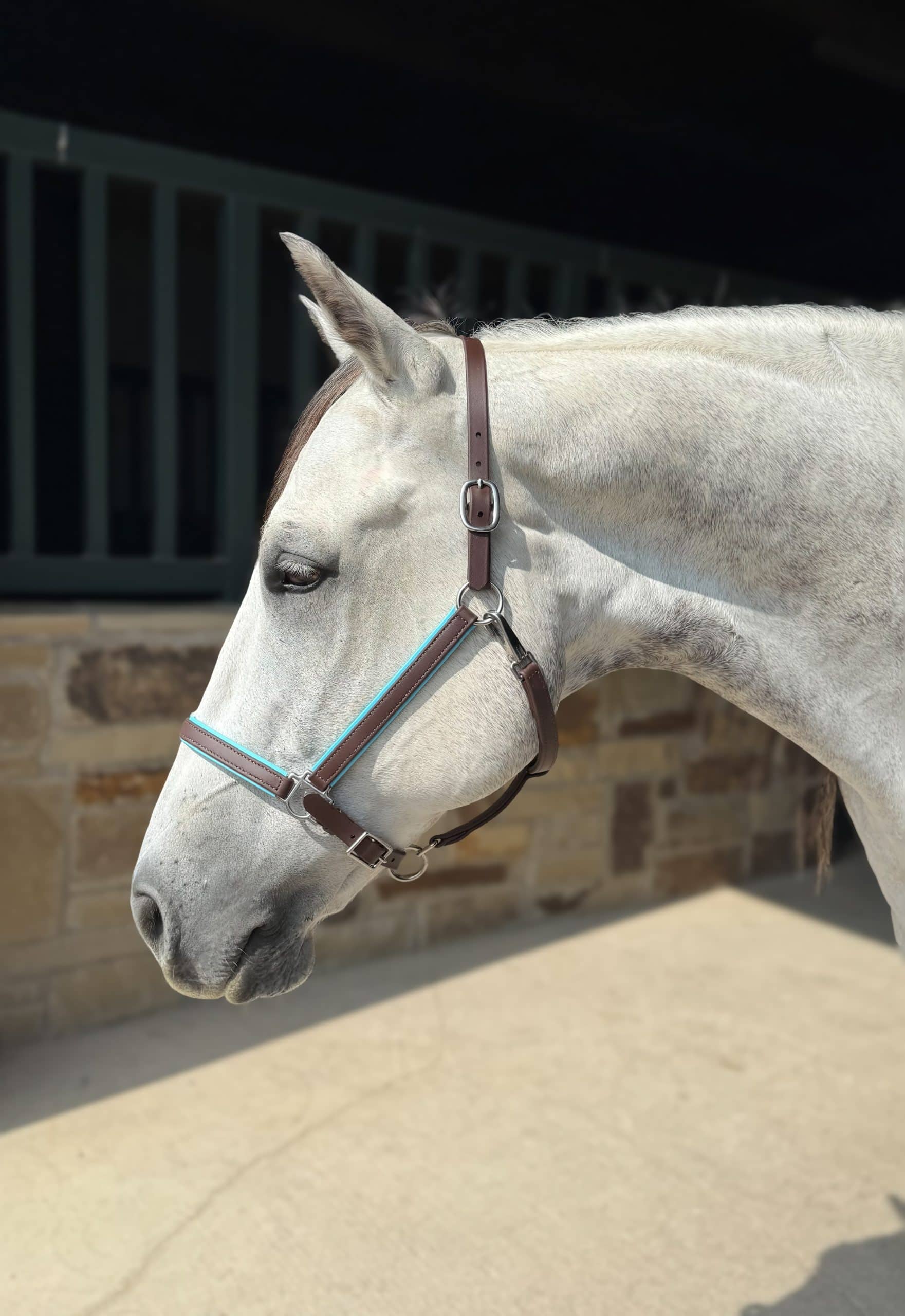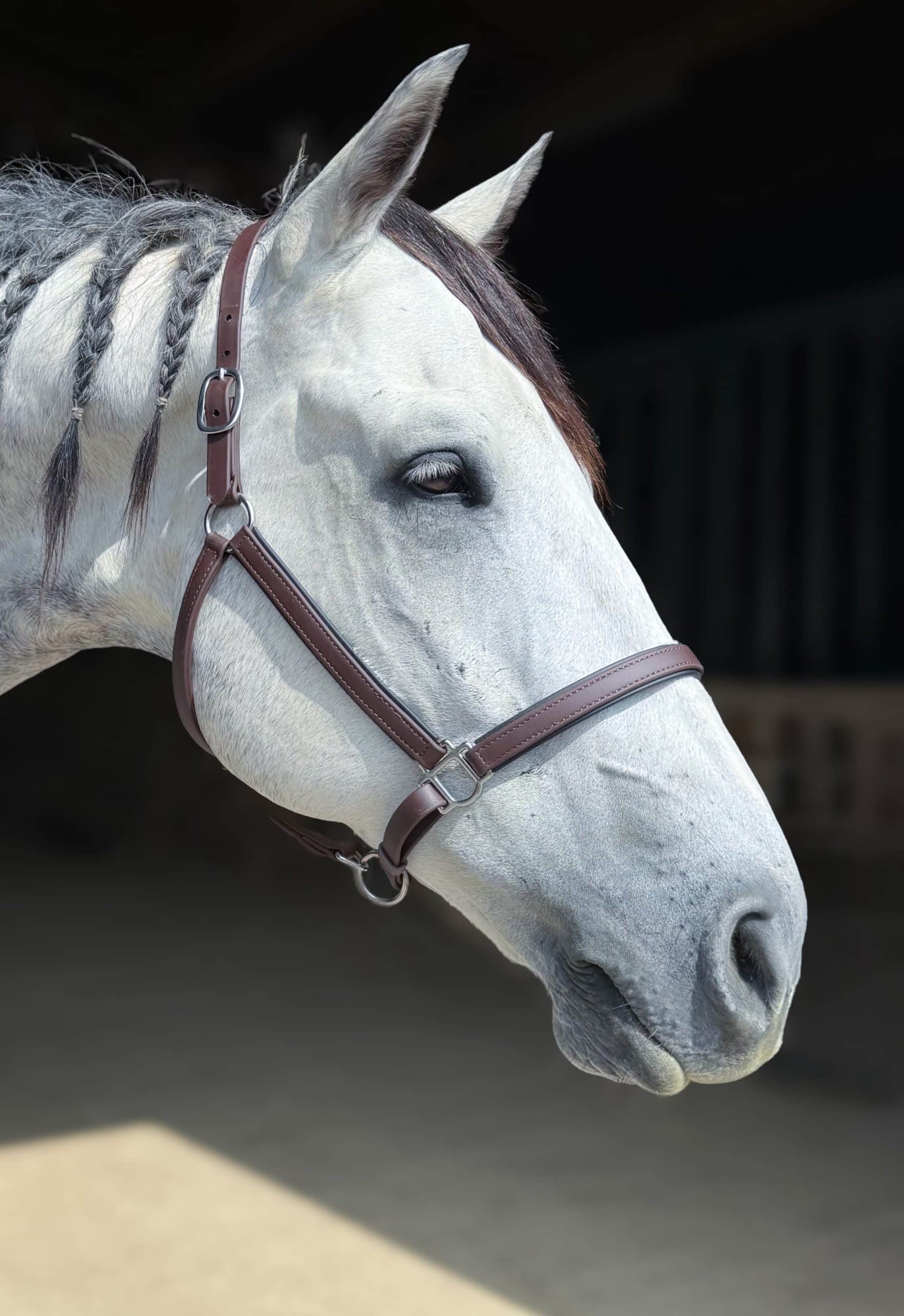 Our beta biothane halters are adjustable under the chin for optimum fit around the noseband. Comes standard with clip at cheek for easy on/off and double buckle crown.